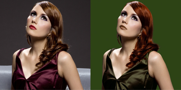 Original image on left. Altered hair, lipstick, and dress on right.