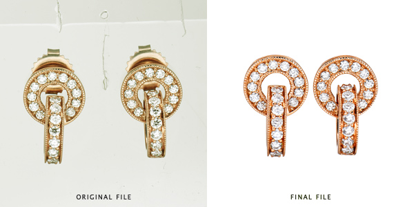 - Raw file of rose gold earrings, silhouetted, pathed, and corrected for final print or web file.